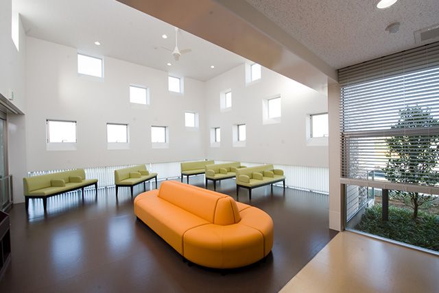 医院空間の中心となる待合室。1.でご紹介した受付スタッフとの位置関係を含め、待合室の向きを調整することで動線が整理され、空間にリズム感も生まれます。【会計時間短縮につながる設計ポイント】